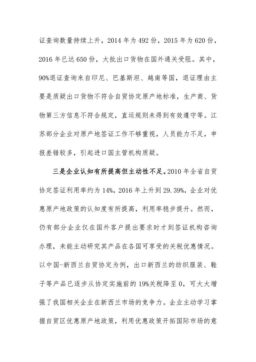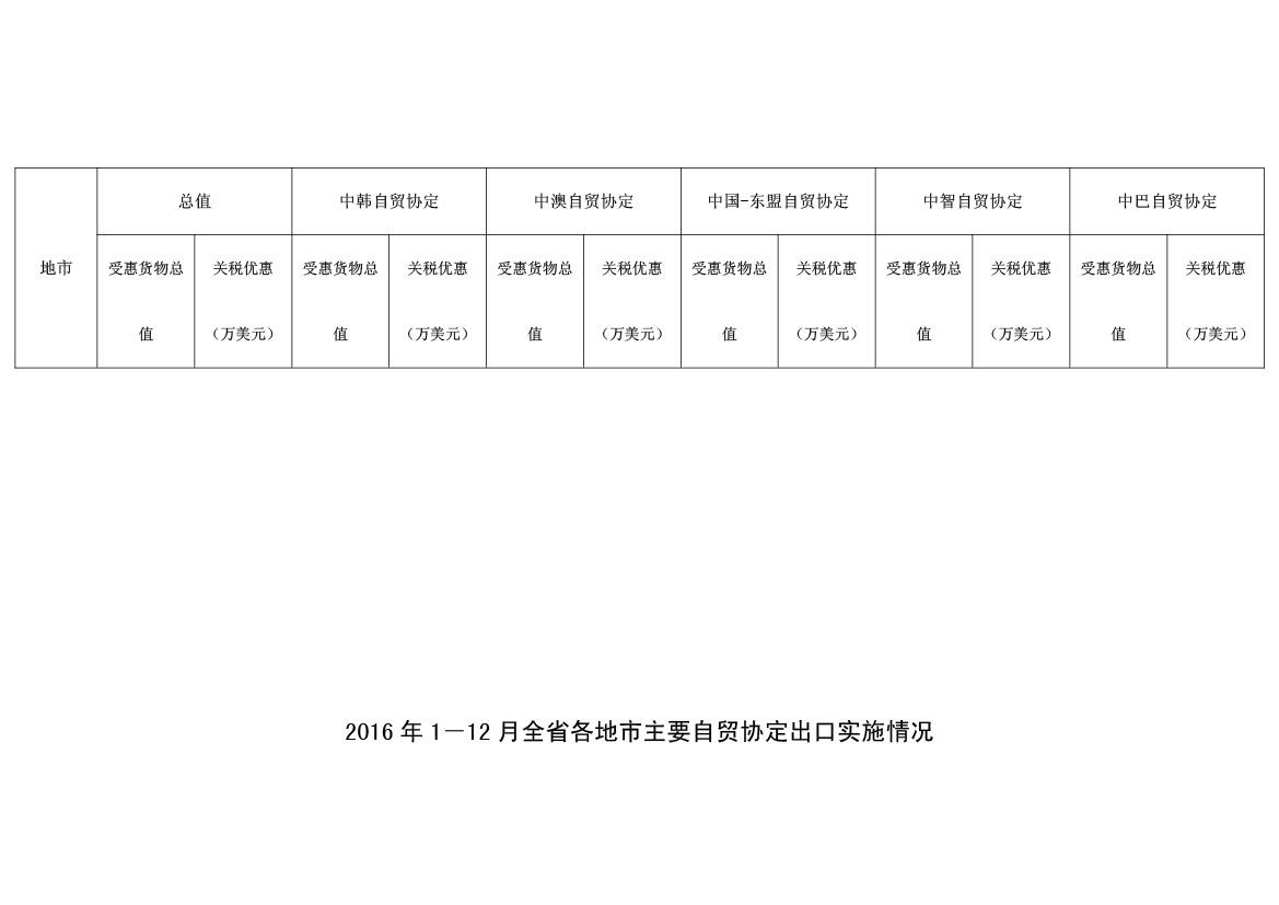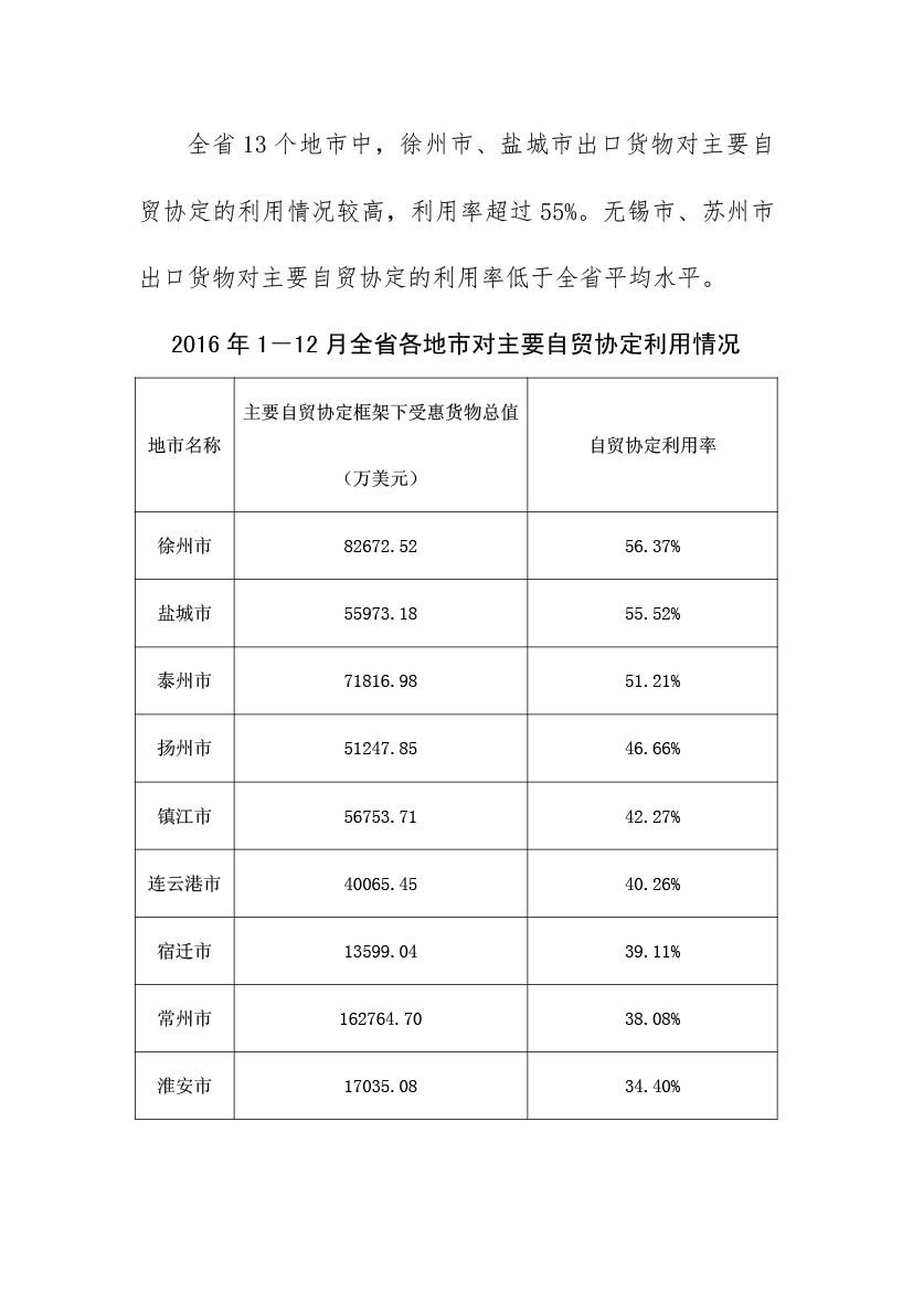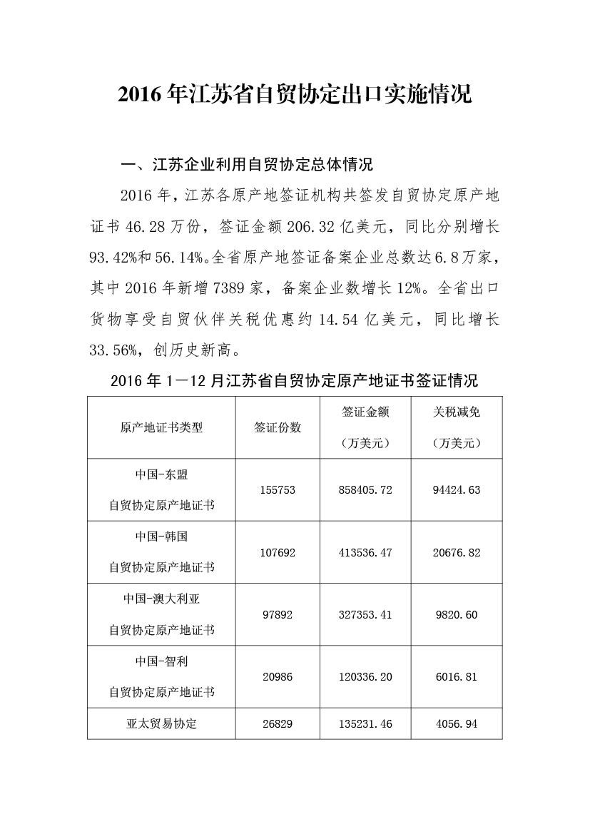 2016年江苏省自贸协定出口实施情况