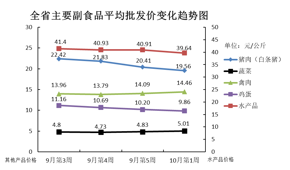 10月份第1周(2021年10月2日-10月8日),本周我省主要副食品平均批发价涨跌互现,波动幅度在3%左右,批发量除蔬菜、禽肉外其余产品均显著减少。平均批发价方面,禽肉、蔬菜环比上涨,鸡蛋、水产品有所下跌,猪肉价格连续一个月持续下跌,跌势较上周略有减缓;批发量方面,蔬菜、禽肉环比增加,猪肉批发量小幅下降,鸡蛋、水产品降幅较大,各副食品批发量经过大幅波动后在本周逐步回归至双节假期之前的水平。