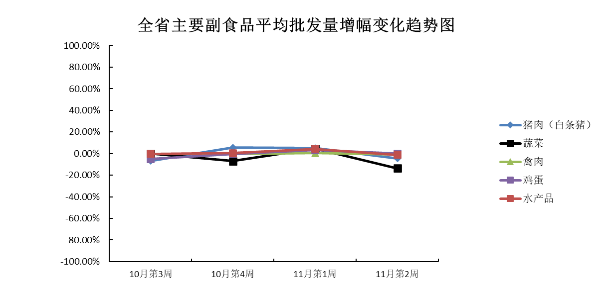 11月份第2周(2022年11月5日—11月11日),本周我省主要副食品,除鸡蛋和水产品外其余产品平均批发价均有所下跌,除鸡蛋外其余产品批发量均有所减少。平均批发价方面,禽肉跌势与水产品涨势均不明显,与上周基本持平;鸡蛋环比上涨;猪肉和蔬菜均环比下跌。批发量方面,鸡蛋增幅与禽肉降幅均不显著,与上周基本持平;水产品小幅减少;猪肉和蔬菜环比减少。