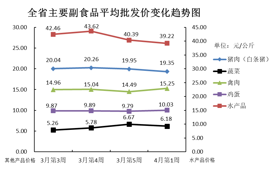 4月份第1周(2021年4月2日—4月8日),本周我省主要副食品平均批发价除禽肉和鸡蛋外其余产品均有所下跌,平均批发量除猪肉和禽肉外其余产品均有所增加。平均批发价方面,猪肉、蔬菜、水产品环比下跌,禽肉和鸡蛋环比上涨。批发量方面,猪肉和禽肉降幅略大,蔬菜和水产品微增,鸡蛋大幅增加。因疫情影响,部分批发交易市场尚未恢复常态经营,产品批发交易量波动较大。