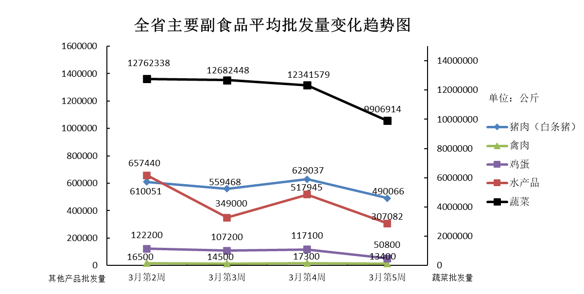 3月份第5周(2021年3月26日—4月1日),本周我省主要副食品平均批发价除蔬菜外其余产品均有所下跌,受疫情影响批发量均大幅减少。平均批发价方面,猪肉和鸡蛋微跌;水产品和禽肉环比下跌;蔬菜涨幅较大。批发量方面,受疫情影响,常州和苏州批发交易量波动较大,致使全省批发交易量大幅减少。