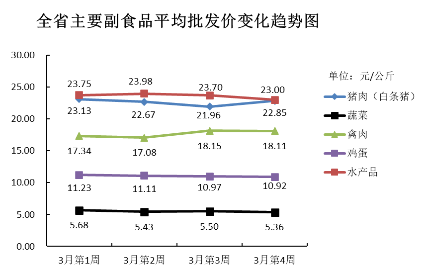3月份第4周(2023年3月18日—3月24日),本周我省主要副食品市场运行情况:除猪肉外其余产品平均批发价均有所下跌;除禽肉外其余产品批发量均有所增加。平均批发价方面,禽肉和鸡蛋跌势均不明显,与上周基本持平;蔬菜和水产品均环比下跌;猪肉环比上涨。批发量方面,禽肉降幅和鸡蛋增幅均不显著,与上周基本持平;水产品小幅增加;蔬菜和猪肉均环比增加。