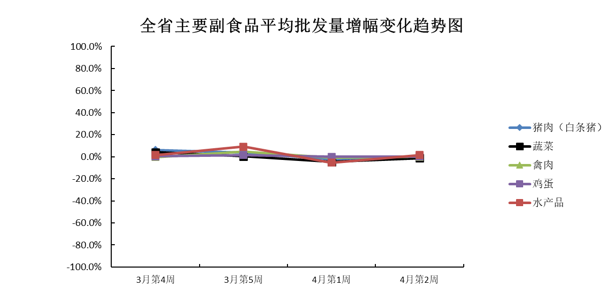 4月份第2周(2023年4月8日—4月14日),本周我省主要副食品市场运行情况:除猪肉和蔬菜外其余产品平均批发价均有所上涨;除蔬菜外其余产品批发量均有所增加。平均批发价方面,猪肉环比下跌;蔬菜小幅下跌;禽肉涨势不显著,与上周基本持平;鸡蛋和水产品均环比上涨。批发量方面,蔬菜小幅减少;猪肉、禽肉和鸡蛋增幅均不明显,与上周基本持平;水产品微增。