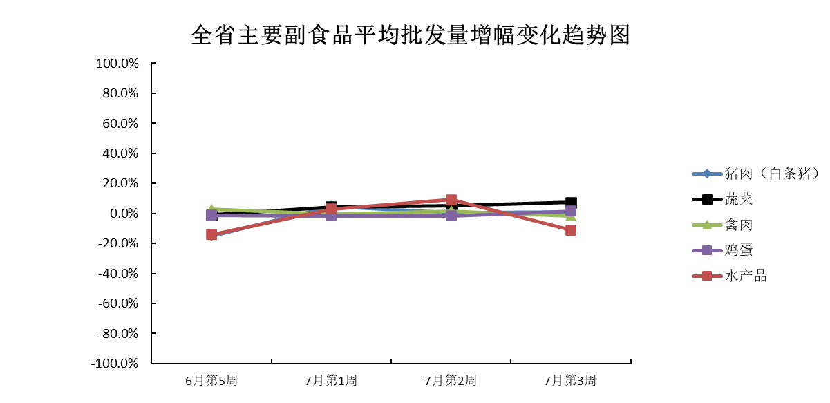 7月份第3周(2023年7月15日—7月21日),本周我省主要副食品市场运行情况:除蔬菜和禽肉外其余产品平均批发价均有所上涨;除禽肉和水产品外其余产品批发量均有所增加。平均批发价方面,水产品涨势、蔬菜跌势和禽肉跌势均不明显,与上周基本持平;猪肉和鸡蛋均小幅上涨。批发量方面,猪肉和鸡蛋均小幅增加;蔬菜环比增加;禽肉小幅减少;水产品环比减少。