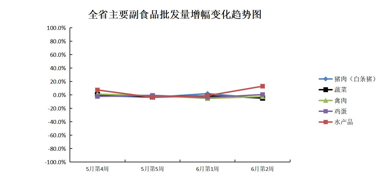 6月份第2周(2024年6月8日—2024年6月14日),本周我省主要副食品市场运行情况:除蔬菜和禽肉外其余产品平均批发价均有所上涨;除鸡蛋和水产品外其余产品批发量均有所减少。平均批发价方面,蔬菜下跌和水产品上涨不明显,与上周基本持平;禽肉小幅下跌;猪肉和鸡蛋均环比上涨。批发量方面,鸡蛋增加不明显,与上周基本持平;猪肉、蔬菜和禽肉均环比减少;因端午假期,水产品增幅较大。