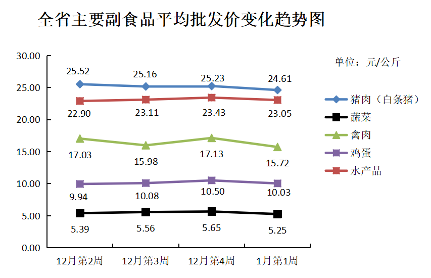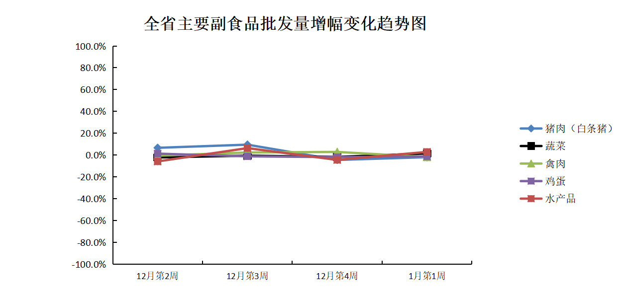 1月份第1周(2024年12月28日—2025年1月3日),本周我省主要副食品市场运行情况:所有产品平均批发价均有所下跌;除蔬菜和水产品外其余产品批发量均有所减少。平均批发价方面,水产品小幅下跌;猪肉、蔬菜、禽肉和鸡蛋均环比下跌。批发量方面,猪肉、禽肉和鸡蛋均小幅减少;蔬菜小幅增加;水产品环比增加。