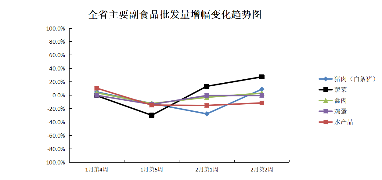 2月份第2周(2025年2月8日—2025年2月14日),本周我省主要副食品市场运行情况:除猪肉和水产品外其余产品平均批发价均有所增加;除鸡蛋和水产品外其余产品批发量均有所增加。平均批发价方面,鸡蛋上涨不明显,与上周基本持平;蔬菜和禽肉均环比上涨;猪肉小幅下跌;水产品环比下跌。批发量方面,鸡蛋减少不明显,与上周基本持平;水产品环比减少;猪肉和禽肉均环比增加;蔬菜增幅较大,超过20%,回归春节假期前水平。