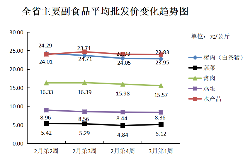 3月份第1周(2025年3月1日—2025年3月7日),本周我省主要副食品市场运行情况:除蔬菜外其余产品平均批发价均有所下跌;除蔬菜和禽肉外其余产品批发量均有所增加。平均批发价方面,猪肉、鸡蛋和水产品均下跌不明显,与上周基本持平;禽肉环比下跌;蔬菜环比上涨。批发量方面,蔬菜、禽肉减少和猪肉增加均不明显,与上周基本持平;鸡蛋和水产品均环比增加。
